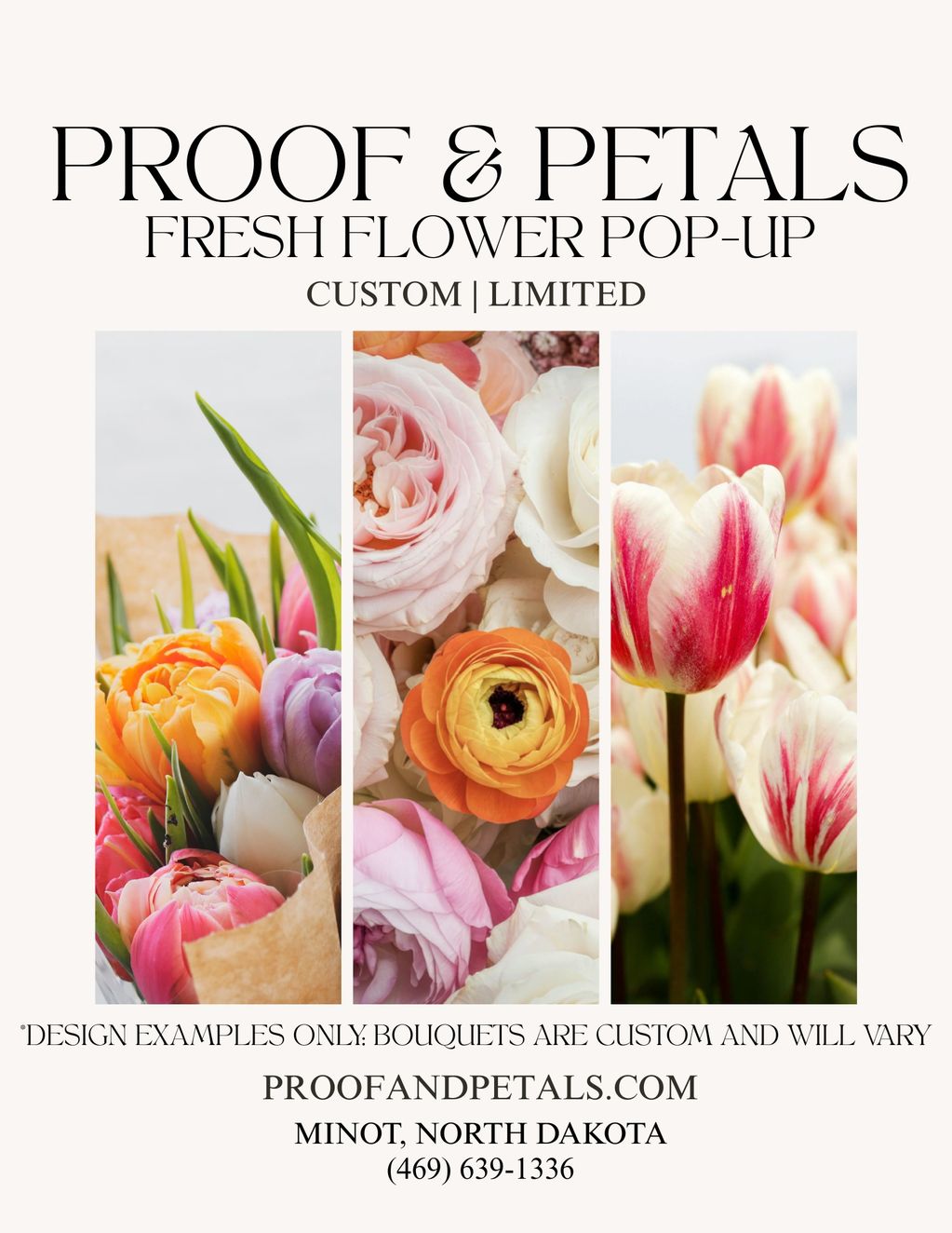 Proof & Petals will be offering a limited collection of fresh floral arrangements at the Minot AFB Exchange Mall on Saturday, April 4th from 10:00 AM to 3:00 PM.